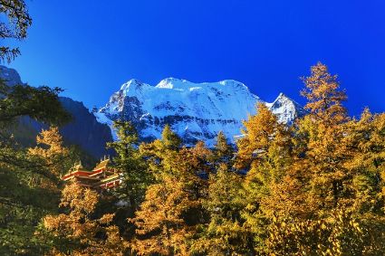 冰晶潔白的央邁勇傲立于天地之間,直指云霄,氣勢(shì)磅礴,讓人肅然起敬。山下,寬闊的峽谷像一條玉帶,環(huán)繞著神山,郁蔥的深林,野花盛開(kāi)的草地、潺潺的溪流在雪山腳下映襯著壯觀的山峰。