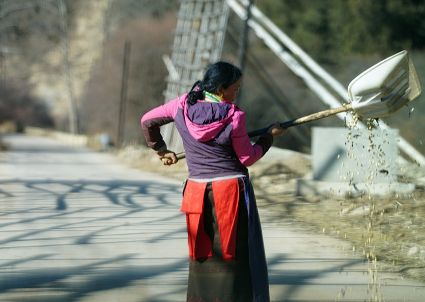 陽(yáng)光溢彩的早晨,我已經(jīng)從對(duì)面山上的柏木林里回來(lái)了。中午時(shí)分,村里的人們又開(kāi)始打碾豆子了,那場(chǎng)面十分誘人。感覺(jué)上我已經(jīng)離開(kāi)村子很遠(yuǎn)了,而在車巴河岸邊,我又一下回到了村子。勞動(dòng)的人,那個(gè)不冰清玉潔呀!