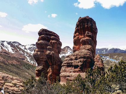 新龍紅山丹霞主要發(fā)育以丹霞石柱、峰叢、方山、石墻、石洞、崖壁等以及各種造型石為主的地貌特征,遠(yuǎn)遠(yuǎn)望去,雄偉壯觀、千姿百態(tài)。因大部分山峰高出雪線,受冰川作用影響顯著,北坡河谷部分有常年片狀積雪覆蓋。