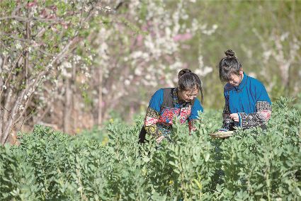 抬望眼,坡上繁花似錦,余暉里,若粉色華蓋覆于坡上,若云若霞。桃林置身峽谷之中,粉面朝天,明艷非凡,宛如閨秀;人家坐落山麓之上,披煙戴云,絕食煙火,疑為仙廬;山溪清卷碧波而去,棲云而眠,漱石而歌,響似佩環(huán)。橘色棧道蜿蜒而上,桃花林里若隱若現(xiàn)棧道間著漢服者,或留倩影,或嗅花香;拾級(jí)而上,又見客家姑娘,身著藍(lán)底配黑褂,綴以白色圖案,提籃摘豆,俯身拾花,別在耳鬢遠(yuǎn)望,若畫中紅印印在發(fā)間,身后白色梨花綠色葉。