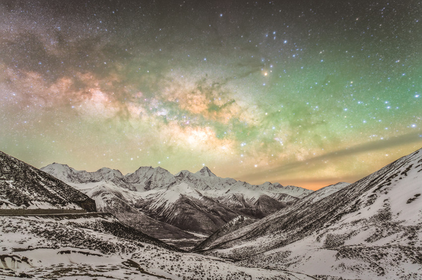 我州地廣人稀、海拔較高,光污染較少,離康定城區(qū)不遠(yuǎn)的折多山頂、子梅埡口、雅哈埡口等地,云層稀薄,空氣干燥,視野開闊,晴朗天氣下,每當(dāng)夜幕降臨,銀河肉眼清晰可見,如煙似紗,置身其中,如夢似幻。星河像一道氣勢磅礴的瀑布、一幅色彩斑斕的油畫、一束絢麗多彩的禮花,令人贊嘆,驚艷眼球,壯美異常。