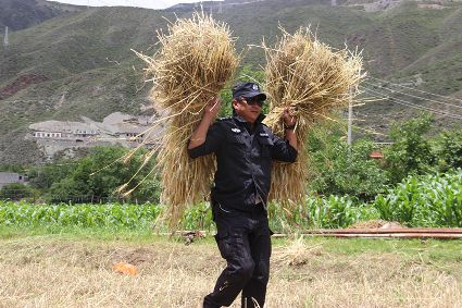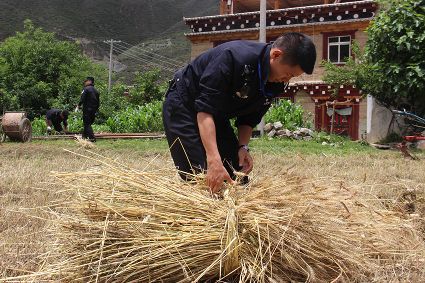 “不能讓鄧珠家成熟了的小麥爛在地里。”近期,巴塘縣陰雨天氣給當(dāng)?shù)卮迕袷崭钚←湈?lái)不便。該縣夏邛派出所民警自發(fā)來(lái)到夏邛鎮(zhèn)河西村特困戶鄧珠家田地,以最快的速度幫助收割、捆綁、脫粒等一系列搶收工作。據(jù)悉,夏邛派出所民警在開(kāi)展“一標(biāo)三實(shí)”工作時(shí),將當(dāng)?shù)乩щy戶、殘疾戶、五保戶等缺少勞動(dòng)力的家庭銘記在心,每逢播種秋收都會(huì)進(jìn)行幫助。