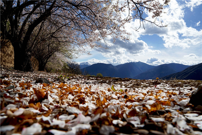 爛漫桃花的暖與遠(yuǎn)方高聳雪山的冷,