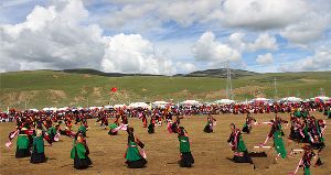 在隨后舉行的首次千人鍋莊表演中,千人起舞,千人狂歡,在聯(lián)歡中展現(xiàn)了理塘各族人民純樸善良、勤勞勇敢、熱情奔放的性格。鍋莊表演中,大家一起勞作、一起舞蹈,以團結(jié)互助的舞蹈形式,展現(xiàn)理塘農(nóng)牧民群眾克服環(huán)境之苦、工作之苦、生活之苦的“缺氧不缺精神、艱苦不怕吃苦”理塘精神。