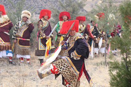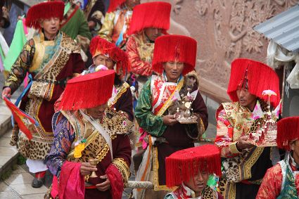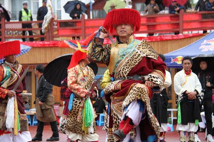 除了歌舞文化,德欽還是民俗文化最大的平臺,神山祭祀是村村寨寨必不可少的活動,在德欽,藏民對山水自然賦予了靈性,認(rèn)為自然也是和人一樣有著生命和靈性,尊重自然演繹出神山祭祀活動豐富多彩?!暗顿潯?藏語稱“百諧”。在德欽農(nóng)村,刀贊是祭祀活動的重頭戲,這一天,不亞于一個盛大的服飾表演。相傳“百諧”是古時村民為消除戰(zhàn)亂,祈福平安的一項傳統(tǒng)祭祀活動,延續(xù)至今已經(jīng)成為一項傳統(tǒng)的民俗活動?!鞍僦C”既是祭祀活動的一個儀式,也是一個獨立的傳統(tǒng)民俗活動,村里每戶一男丁在這一天必須參加“百諧”。“蘇夏”是村里男人戴的最為隆重的帽子,他不同于金邊帽和狐皮帽。長刀是“刀贊”的道具, “吉祥的日子里,我們一敬天地,賜給我們帶來幸福的生活;再敬尊敬的共產(chǎn)黨,為我們帶來平安吉祥;三敬慈祥的雙親,教會我們?nèi)绾巫鲆粋€好人……”朗朗上口的說詞伴著閃閃的刀光起舞,頗具康巴壯士的英武陽剛。