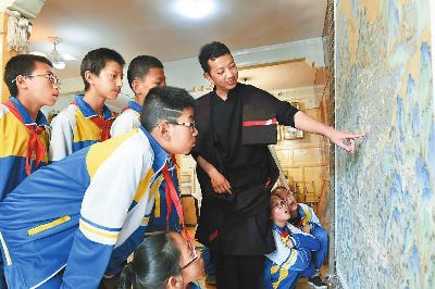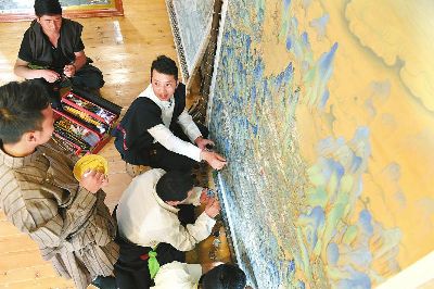 著著是當(dāng)?shù)匦∮忻麣獾漠嫀?,?4歲從臨摹、勾線定型、著色染色開(kāi)始學(xué)起,3年后就出師獨(dú)立作畫。17年時(shí)間,他繪制了3000多平方米的壁畫和數(shù)百幅唐卡,光筆就畫禿了20000多支。去年,著著憑借《南絲路一帶緣藏漢人一家親》成為當(dāng)年文藝界最高獎(jiǎng)山花獎(jiǎng)的獲得者。今年,他圍繞“一帶一路、藏漢和睦”為主題而創(chuàng)作的大幅唐卡畫作也即將收尾。