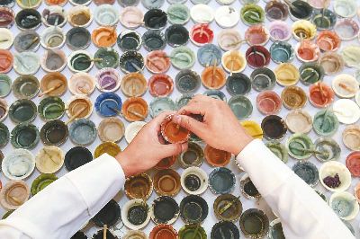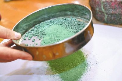 傳統(tǒng)的唐卡是藏族文化中一種獨(dú)具特色的繪畫藝術(shù)形式,需經(jīng)繃布、打磨、定位、起稿、涂色、暈染、拉線條、拉金線等多種程序,天然原料作色保證了畫作幾百年后色澤還依然鮮艷。在著著的畫室里,擺放了百個(gè)裝滿各色礦物質(zhì)顏料的調(diào)色小碗,“上色用的是延續(xù)千年的礦物研磨顏料。”為了讓顏料作色更均勻,著著還用自己的辦法搞出了專用的顏料攪拌機(jī)。