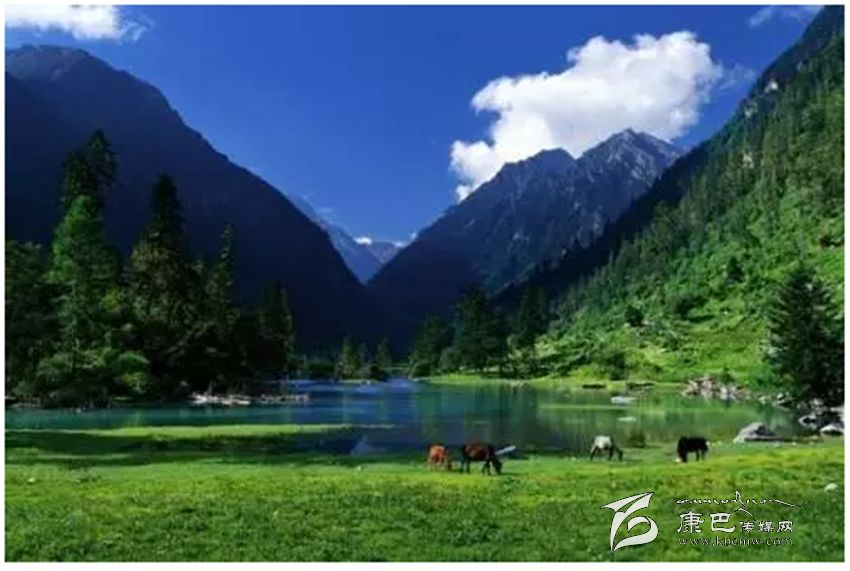 蓮花湖位于康定縣普沙絨鄉(xiāng)苦西絨山谷中。夏季如鏡的水面倒影著森林和天空,寧靜而致遠(yuǎn),湖泊周圍如翡翠般碧綠的草坪,成群的牛、羊如珍珠般撒落在草原上。秋季,滿山色彩絢麗,多姿多彩的群山像淋透了顏料,紅色、黃色、青色、綠色,映襯藍(lán)藍(lán)的天空。