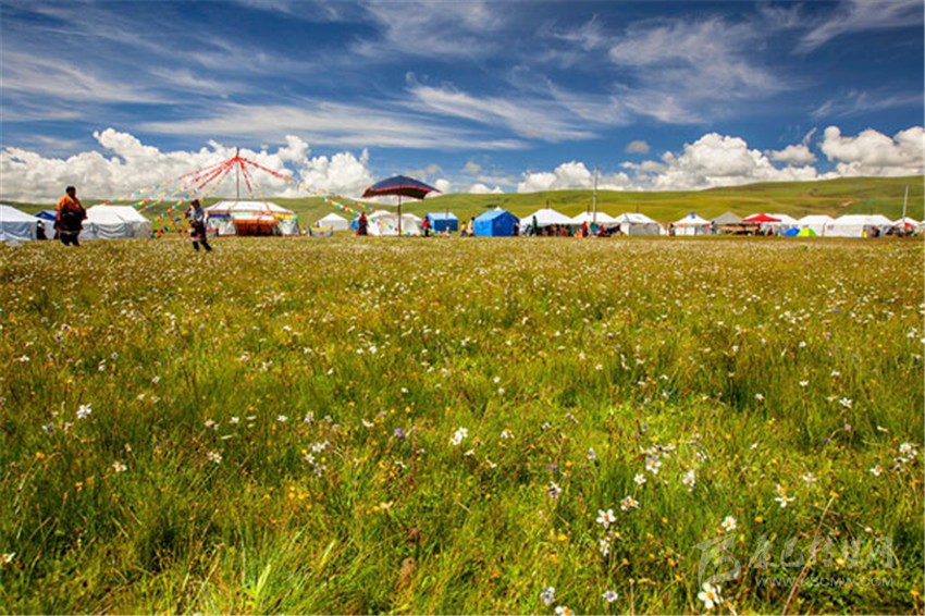 拉日馬大草原,藏語譯為神仙居住的地方,寬闊的草原、豐茂的水草、茫茫的-、蜿蜒清澈的拉曲河,構成的一幅天然畫卷。加之當?shù)啬撩窦儤愕拿耧L、散落在草原上星星點點的牛群、帳篷,給人一種回歸之感。倘若是在夏季,草原上成為花的海洋,四處飄溢著花的芬芳和奶香,在醉人的季節(jié)里,定會使人留連忘返。