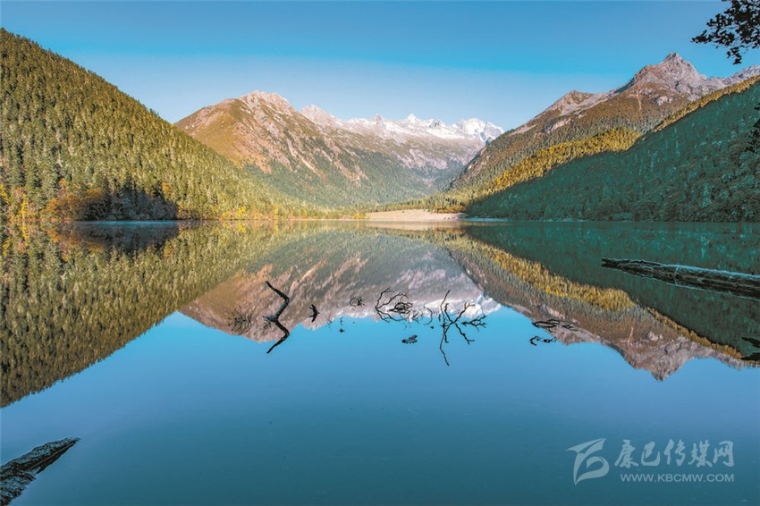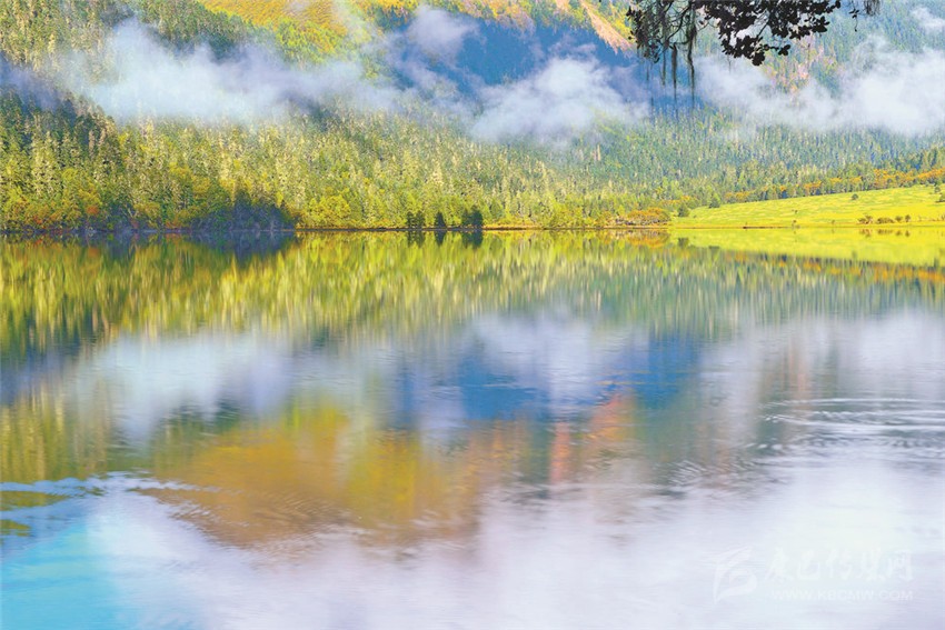 置身于雪山、湖色與草色,陽光精確地照在一棵金色的樹上,樹的光亮奪目與遠(yuǎn)處云霧繚繞的暗山形成反差,如夢如醉。