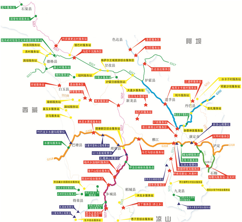 77個服務(wù)區(qū)(站、點)地處我州六條旅游線路和十條景觀大道。主要集中在:G318線(瀘定——康定——雅江——理塘——巴塘),G350線(丹巴——八美——道孚——爐霍——色達),S217線(理塘——稻城——香格里拉鎮(zhèn)——亞?。琒211線、S434線(瀘定——海螺溝——榆林)。
