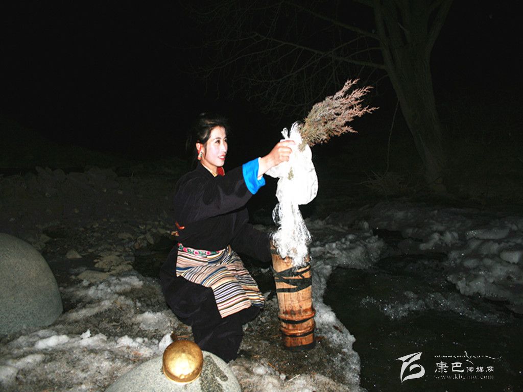 在除夕這天,家里的婦女會(huì)把庭院,房屋重新打掃一遍。把垃圾再清理一次。因?yàn)榱?xí)俗認(rèn)為,初一掃地和除垃圾會(huì)把一年的財(cái)運(yùn)和好運(yùn)都掃走。這天,大人小孩還要忙著洗頭、洗澡,搞好個(gè)人清潔衛(wèi)生。而除夕之夜最重要的一個(gè)儀式是“搶頭水”。(新年的第一桶水—晨星水)。傳說,晨星水是人間最吉祥的水。它可以獻(xiàn)神,可以潔身,可以祛病,洗滌一切污垢和不祥,帶來平安和幸福。從除夕夜十二時(shí)開始,一個(gè)個(gè)懷抱柏樹枝和哈達(dá)的姑娘或小伙子們披著繁星,爭先恐后地去背晨星水。第一個(gè)先到河邊的要熏燃桑煙,并用哈達(dá)繞上柏樹枝蘸水向空中拋灑三次,并把柏樹枝放在河邊。背回的晨星水首先要供奉佛祖。然后才可以用來燒茶、洗漱。而家里的五谷斗上則盛滿了糌粑、炒青稞粒、人參果等食品,上插青稞穗,也有在八寶碗里用糌粑和五彩酥油做成“切巴”,供奉在佛堂里。這一切都是為了祈禱來年風(fēng)調(diào)雨順、人畜兩旺、喜獲豐收。除夕夜,在正房桌子上還要擺上各式油炸果子、牛肉坨坨、糖果以及青稞美酒、飲料等等美味佳肴,開始迎接新年的到來。