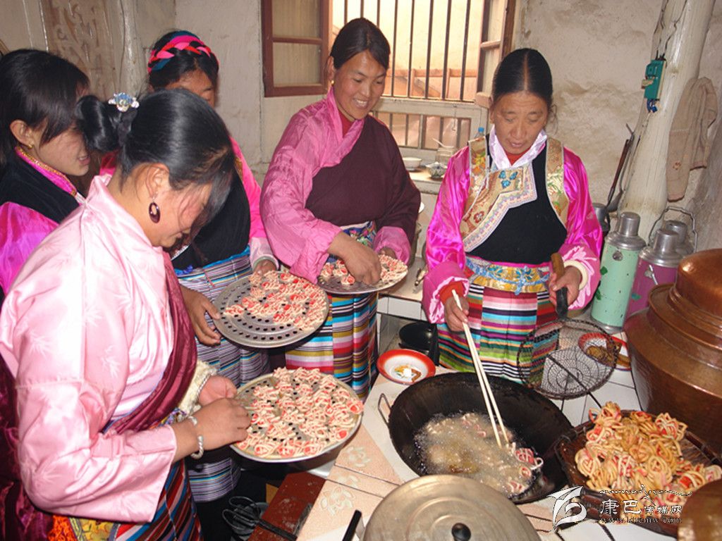 巴塘人一年當(dāng)中有很多重要的節(jié)日,而最重要的莫過(guò)于過(guò)春節(jié)。隨著農(nóng)歷新年的來(lái)臨,巴塘人過(guò)春節(jié)的氛圍也越來(lái)越濃烈了。掃塵、貼春聯(lián)、殺年豬、罐血腸、樹(shù)經(jīng)幡、獻(xiàn)“切瑪” 、曬牛肉干、做長(zhǎng)面、炸“花茹” 、 釀青稞酒等等。一時(shí)間,人們臉上綻放出春天的笑顏,讓人仿佛看到了春的腳步。在眾多的風(fēng)味飲食中,炸“花茹” 、 吃長(zhǎng)面(當(dāng)?shù)厝朔Q之為“金絲面”)是巴塘人春節(jié)時(shí)家筵中必不可缺的美食佳肴。