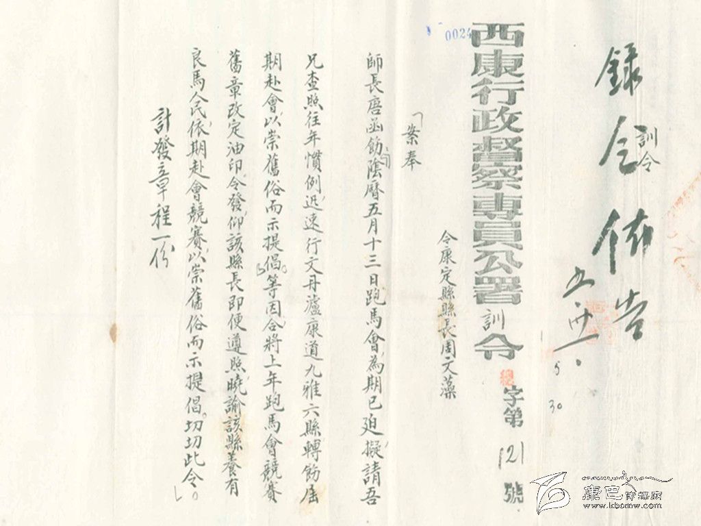康定城各民族雜居,各種民族文化相融,形成了康定特有的民俗、風(fēng)俗?,F(xiàn)在已經(jīng)不可能見到的“郭達將軍廟會”和每年“四月八轉(zhuǎn)山會”期間在康定城郊舉辦的“賽馬會”,這些屬于康定特有的民俗風(fēng)情,在民國時期曾經(jīng)盛況空前。舉辦“郭達將軍廟會”,警察要出來維持秩序。這份賽馬簡章特指1940年“四月八轉(zhuǎn)山會”時的一次賽馬。據(jù)《甘孜州志》記載:在1940年的5月,由于有“康定、瀘定、九龍、丹巴、道孚、乾寧”騎手參加賽馬活動,才制定了這份“新簡章”。
