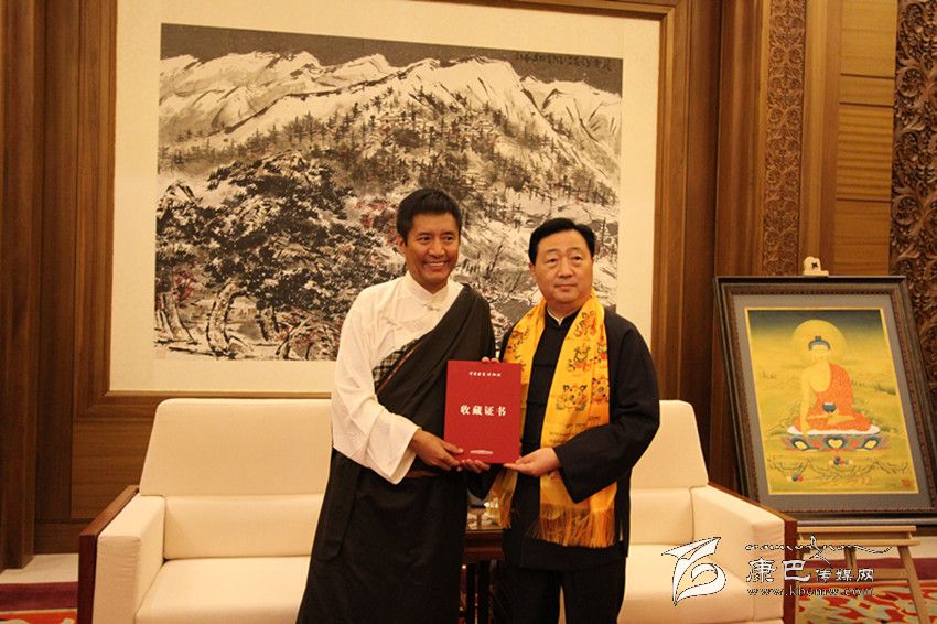 產(chǎn)業(yè)化發(fā)展的探索之路,不僅圓了年敘·多吉頓珠的“文化產(chǎn)業(yè)夢”,而且也讓他實現(xiàn)了一次華麗轉(zhuǎn)身,成為一名有擔當?shù)钠髽I(yè)家。今年9月5日至15日,由中華文化發(fā)展促進會、西藏自治區(qū)文化廳、西藏自治區(qū)文學藝術(shù)界聯(lián)合會、西藏自治區(qū)文化產(chǎn)業(yè)協(xié)會主辦,西藏崗地文化產(chǎn)業(yè)集團、西藏拉姆拉綽唐卡畫院承辦的“西藏唐卡藝術(shù)——多吉頓珠、丁噶唐卡作品展“在北京中國國家博物館舉行。他和丁嘎先生現(xiàn)場向國家博物館捐贈了《釋迦牟尼》、《五方度母》、《綠度母》和《觀音》四幅精品,這是國家博物館首次收藏多派唐卡和嘎瑪嘎智畫派唐卡,填補了國家博物館館藏嘎瑪嘎止畫派和多派唐卡的空白。國家博物館館長呂章申先生熱情為兩位大師頒發(fā)了收藏證書并激動地說:“多吉頓珠先生和丁嘎先生捐贈的精品力作,豐富了中國國家博物館的館藏,更好地弘揚了西藏文化藝術(shù)。國家博物館有責任把最好的藝術(shù)品收藏起來,留存于后世。”