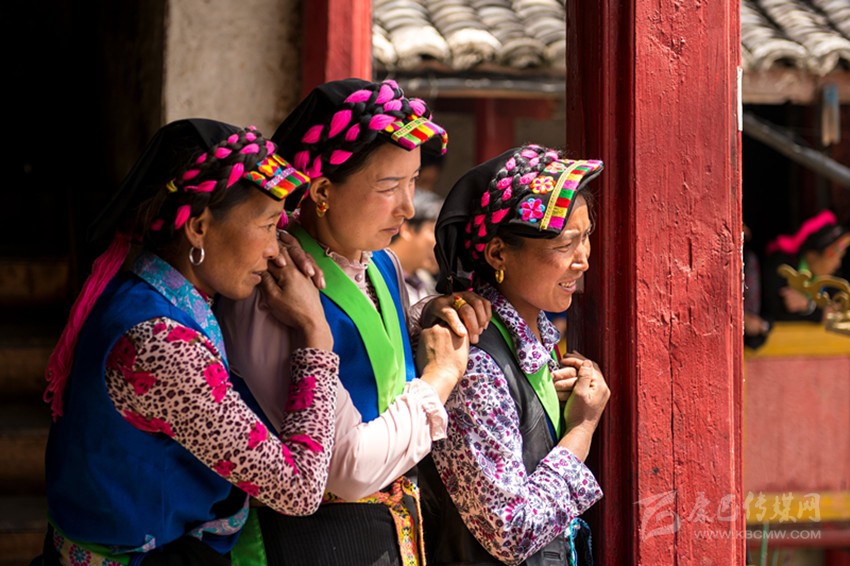 在魚通地區(qū),不少人還保持著古老的裝束,男子穿青色或黑色的長布衫,用布帶束腰,勞作或天冷時(shí)會(huì)在外加一件用動(dòng)物皮加工做成的皮褂子,老人以青布包頭,帕長約3丈左右,纏成大盤頭。女子也穿長衫,頭戴方形青色頭帕,腰系圍腰帕。頭帕繡有彩色花邊,發(fā)辮用青色、藍(lán)色或紅色的絨線盤于頭帕之上。圍腰帕為梯形,上窄下寬,邊緣用藍(lán)色或淺綠色布料做裝飾。圍腰帕分為兩種,一種繡著各種精美圖案,一般在重大節(jié)日和喜宴上穿戴,一種比較簡(jiǎn)潔素凈,一般在日常生活中穿戴。