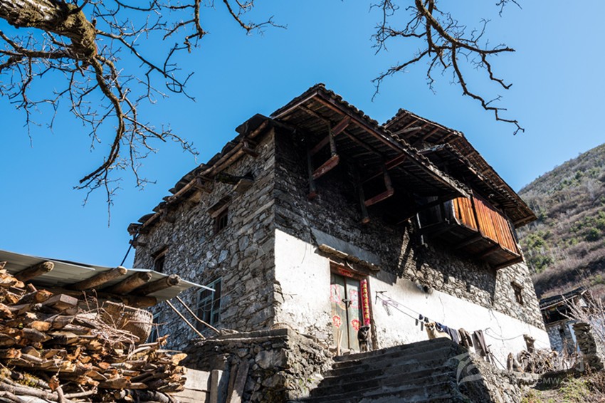 魚通人的房屋符合古人對(duì)居所背山面水的要求,多依山而建。房屋為木石混合結(jié)構(gòu),以片石木材和黃泥為主要材料建成,當(dāng)?shù)厝朔Q之為“碉房”。房屋用石塊壘起,以木頭為墻筋,每隔一定高度,橫砌進(jìn)入石塊,融為一體,使之更為堅(jiān)固牢靠。“碉房” 一般為三層或四層,呈四角或六角形。底層為關(guān)牲畜。第二層為“堂屋”, 在過去,是集做飯、吃飯、烤火、家人日?;顒?dòng)為一體的場(chǎng)所,地上設(shè)有火塘、灶,并在火塘上設(shè)石制三腳鍋莊或鐵三腳。第三層為各居室,有的設(shè)有貯藏室和會(huì)客屋。頂層為經(jīng)堂,室外為曬壩,作打場(chǎng)、曬場(chǎng)用。有些在外側(cè)設(shè)有一小吊腳樓,可堆放雜物。隨著時(shí)間的流逝,古老的碉房已無法滿足現(xiàn)在居民的需求,已很少有人居住,而新式碉房在傳統(tǒng)的基礎(chǔ)上開始出現(xiàn)。