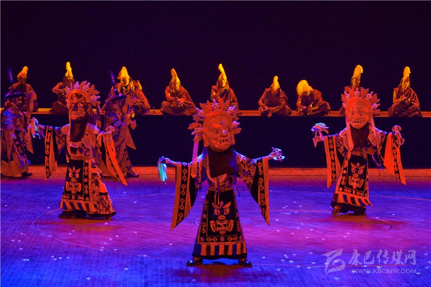 《亞丁?三怙主》歌舞劇不僅從藏族人民日常生產(chǎn)生活中提煉出很多舞蹈文化元素,還對(duì)宗教樂舞進(jìn)行了合理的借鑒。舞劇中用了道孚嘛呢鍋莊、德格卓且、巴塘弦子、爐霍鍋莊、石渠真達(dá)鍋莊、丹巴鍋莊、稻城鍋莊等民間舞蹈等元素,加以深化再創(chuàng)作,把原有的民間舞蹈的步伐、舞姿進(jìn)行夸張性的舞臺(tái)處理,并配以適當(dāng)?shù)年?duì)形,以更加適應(yīng)劇場(chǎng)舞臺(tái)的表演;大膽創(chuàng)新引入寺廟樂舞,寺廟樂舞本是藏傳佛教寺廟在宗教節(jié)日表演的祈福性舞蹈,舞劇編創(chuàng)人員合理借用寺廟樂舞的音樂、步伐、面具等,用以表現(xiàn)藏族人民與自然抗?fàn)?,不懼不屈的精神面貌;用泥土筑墻本是藏族人民建造房屋時(shí)的一種建筑技藝,在民間演繹成為地方舞種,舞劇編創(chuàng)人員將筑墻的基本步伐和動(dòng)作加以提煉,編創(chuàng)了一段約兩分鐘的打舞,用夸張的步伐和動(dòng)作,配以鏗鏘有力的勞動(dòng)號(hào)子,將豪氣灑脫的打墻舞氣氛推向高潮,以表達(dá)藏族人民的勤勞、勇敢與豪邁。州委黨校高級(jí)講師陶勇說:“《亞丁?三怙主》歌舞劇旨在講解香格里拉之魂,詮釋亞丁三怙主的本意,闡釋三座神山文化包含佛陀的核心教義。亞丁三怙主即仙乃日(觀世音菩薩)、央邁勇(文殊菩薩)、夏諾多吉(金剛手菩薩),它們分別象征慈悲、智慧、力量。這部歌舞劇是解讀藏民族精神文化、弘揚(yáng)藏民族真善美勇、傳遞康巴文化真諦的民族歌舞劇。歌舞劇通過《序》、《慈明》、《慧明》、《力明》、《尾聲》五個(gè)篇章,充分展示藏族傳統(tǒng)文化中熱情、好客、善良、慈悲、勇敢、追求和諧的優(yōu)秀價(jià)值觀,將民族文化融入到社會(huì)主義核心價(jià)值觀,展現(xiàn)了當(dāng)代人民群眾的幸福生活。同時(shí)對(duì)游客來講不僅豐富了亞丁文化,填補(bǔ)了游人僅僅觀賞雪山不知文化內(nèi)涵的短板,為以后推介甘孜州做了很好的示范?!?/span>