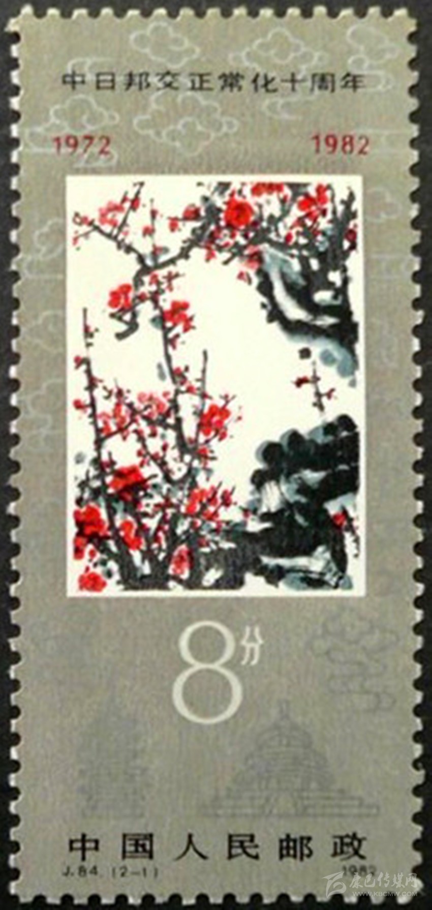 1982年12月發(fā)行的《 中日邦交正?;苣辍芳o念郵票(2-1)“梅花”。