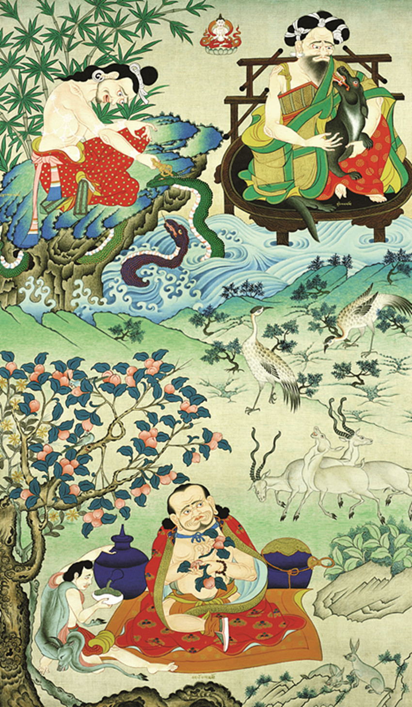 而從外部來看,元朝開始,西藏正式納入中國版圖,中原漢地的繪畫和西藏唐卡也大大增加了融匯交流的可能性。明朝延續(xù)了元朝對西藏的權(quán)力控制。政治關(guān)系日益穩(wěn)固,漢藏關(guān)系愈發(fā)融洽,文化交流也日漸繁盛。隨著漢地羅漢畫和青綠山水畫的技法大量進入西藏。于是唐卡繪畫從十五世紀開始逐漸弱化印度、尼泊爾的影響,主動學習、借鑒漢地的繪畫藝術(shù)。這是一個巨大的美學沖擊,它直接助攻了西藏唐卡本土化的進程。