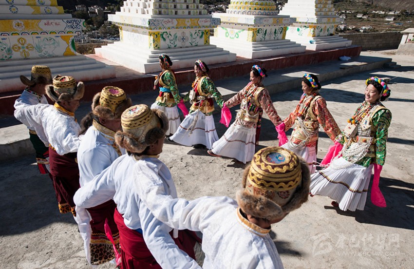 這當(dāng)中最具有依憑的觀點是:“學(xué)羌”是藏族傳說人物江根阿坡創(chuàng)作的,他綜合了康巴三江沿岸的鍋莊與踏歌的舞步,又融入了滇西北少數(shù)民族的一些舞蹈元素。從歷史上看,得榮瓦卡(茶馬古道金沙江碼頭)曾是茶馬古道上的一座重鎮(zhèn),各民族的馬幫和商人曾集聚在瓦卡碼頭?;蛟S,人們常常在這里載歌載舞,久而久之,在碰撞和交流中慢慢融合出了一個新的舞蹈:學(xué)羌。