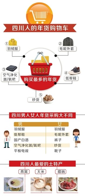 還有幾天就過年了,你們家買了哪些年貨?近日,電商平臺阿里巴巴和京東先后推出了年貨大數據。從這些數據中,我們能看到一個典型成都人的年貨網絡購物車是這樣的:購買最多的年貨還是衣服,其中羽絨服、毛呢外套是成都人的最愛;家電和電子產品愛買空氣凈化設備和玫瑰金iPhone7手機;食品是山核桃等炒貨,以及國產白酒。在女性偏好酒水消費的排名中,四川女性排名第五。