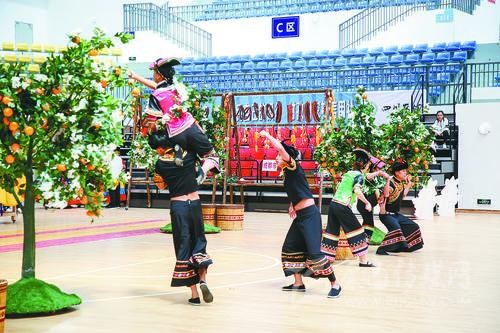 雅安市代表團(tuán)教練李鏡文告訴記者,《石炯諧博》表演項(xiàng)目依托當(dāng)?shù)匾图颐袼?,在黃果柑豐收的季節(jié),石棉縣彝族小伙、姑娘們?cè)诠掷锊烧S果柑時(shí)所產(chǎn)生的勞動(dòng)趣味競(jìng)技活動(dòng)的演繹,反映了少數(shù)民族地區(qū)經(jīng)濟(jì)發(fā)展、社會(huì)繁榮穩(wěn)定、各族人民安居樂(lè)業(yè)的生活和精神風(fēng)貌。