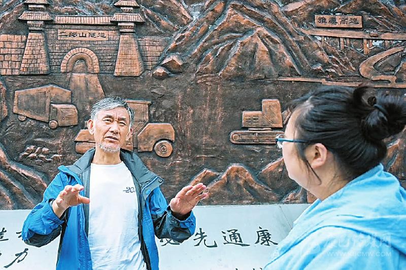 老二郎山隧道外,川報(bào)老記者林衛(wèi)(左)回憶當(dāng)年的采訪情景。