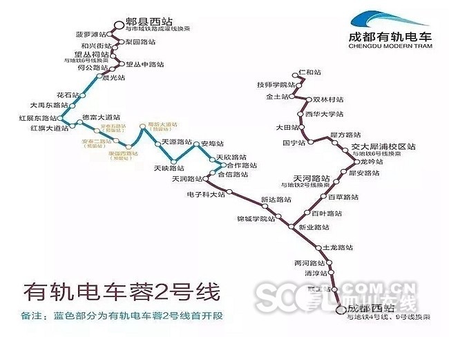 呈Y形布局,非首開(kāi)段起于成都西站沿線經(jīng)過(guò)望叢祠、石牛公園等景點(diǎn)及西南交通大學(xué)、西華大學(xué)等多所高校,抵達(dá)仁和站和郫縣西站。