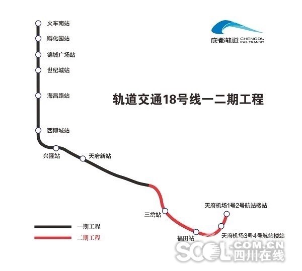 服務(wù)于成都市區(qū)與成都天府國(guó)際機(jī)場(chǎng)之間,北起火車(chē)南站,南至天府新機(jī)場(chǎng),線路全長(zhǎng)66.8Km,共設(shè)12座車(chē)站。(圖據(jù)成都軌道建設(shè)公司)