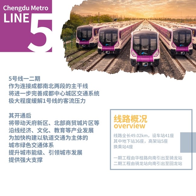 其中,5號(hào)線一二期作為連接成都南北兩段的主干線,將進(jìn)一步完善成都中心城區(qū)交通系統(tǒng),極大程度緩解1號(hào)線的客流壓力,其開(kāi)通后將帶動(dòng)天府新區(qū)、北部商貿(mào)城片區(qū)等沿線經(jīng)濟(jì)、文化、教育等產(chǎn)業(yè)發(fā)展,為加快構(gòu)建以軌道交通為主體的城市綠色交通體系,提升城市能級(jí)、引領(lǐng)城市發(fā)展提供強(qiáng)大支撐。