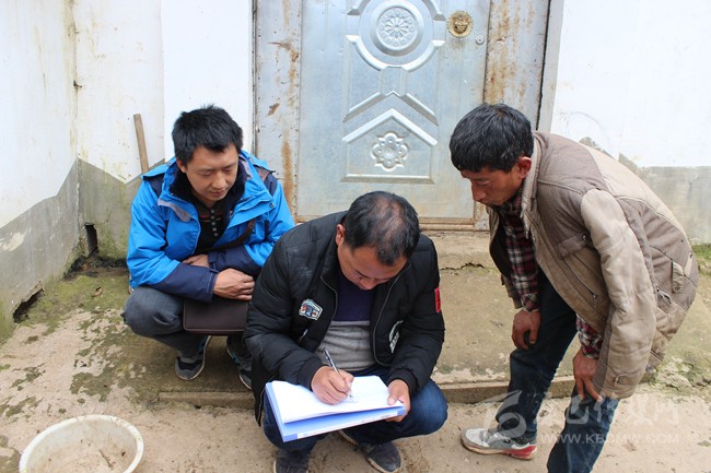牟爾古(中)入戶核實(shí)收入、登記年輕人的基本信息。受訪者供圖