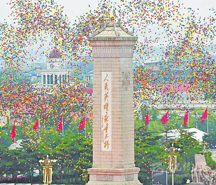 天安門城樓燈火璀璨,廣場(chǎng)上慶祝大會(huì)的準(zhǔn)備工作緊鑼密鼓。三軍儀仗隊(duì)、解放軍聯(lián)合軍樂團(tuán),還有北京各高校學(xué)生組成的合唱團(tuán),正在進(jìn)行最后的排練。