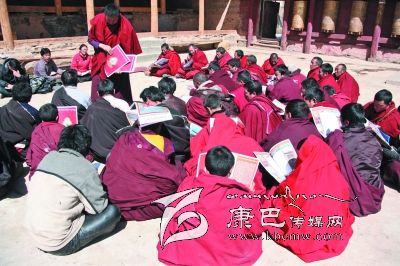德格縣滿金寺僧人正在閱讀群眾工作特刊藏文版。(本報資料照片)