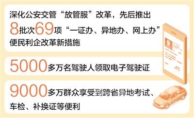 公安交管“跨省通辦”改革深入推進(jìn),駕駛證“全國(guó)通考”、機(jī)動(dòng)車(chē)“全國(guó)通檢”等改革措施全面落地,已有9000多萬(wàn)群眾享受到跨省異地考試、車(chē)檢、補(bǔ)換證、處理交通違法等便利,減少多次往返,更好適應(yīng)人員、貨物、車(chē)輛大流動(dòng)的新形勢(shì)。