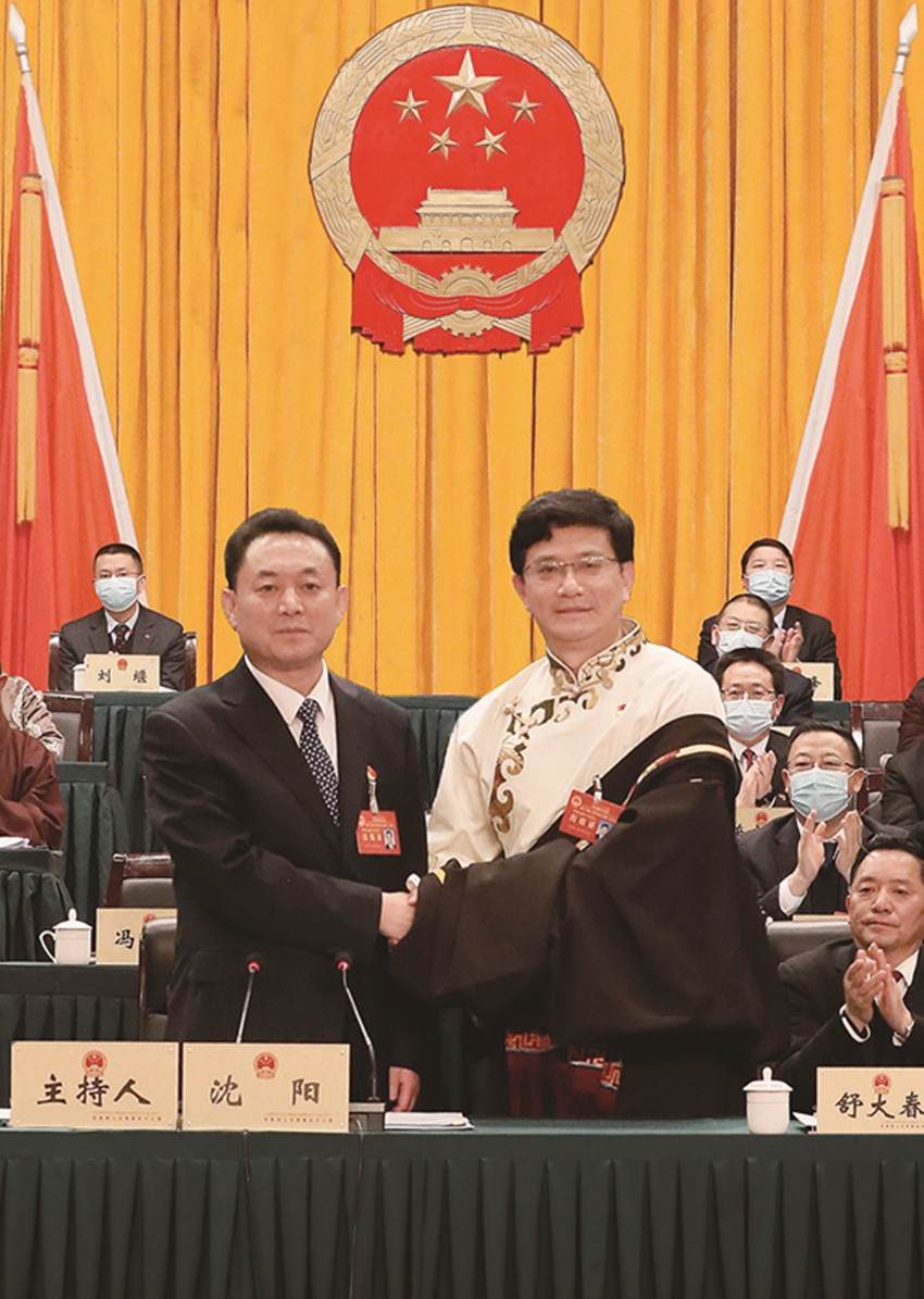 州十三屆人大一次會(huì)議上,州委書(shū)記沈陽(yáng)向當(dāng)選的州人民政府州長(zhǎng)馮發(fā)貴表示祝賀。