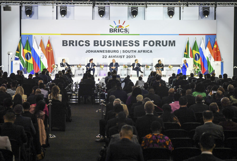 這是2023年8月22日在南非約翰內斯堡拍攝的金磚國家工商論壇現(xiàn)場。新華社記者 李亞輝 攝