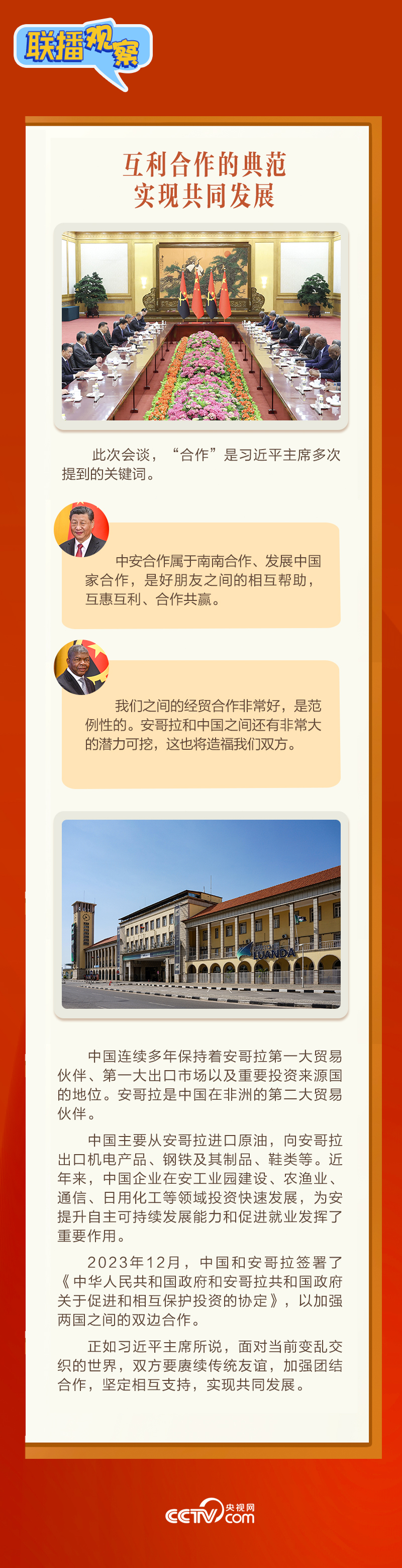 聯(lián)播+3月15日,習(xí)近平主席在人民大會堂同來華進(jìn)行國事訪問的安哥拉總統(tǒng)洛倫索舉行會談。會談中,習(xí)主席稱洛倫索總統(tǒng)為“中國人民的老朋友”,評價(jià)中安關(guān)系“歷經(jīng)國際風(fēng)云變幻考驗(yàn),實(shí)實(shí)在在造福了兩國人民”。