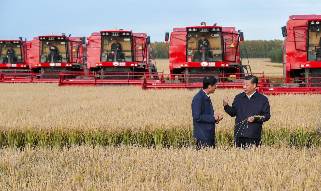 2018年9月25日,金秋時(shí)節(jié),稻浪滾滾,黑龍江農(nóng)墾建三江管理局七星農(nóng)場萬畝大地號豐收在望。習(xí)近平總書記走進(jìn)正在收割的地塊,拿著稻穗,同工作人員交談,詳細(xì)了解糧食生產(chǎn)和收獲情況。