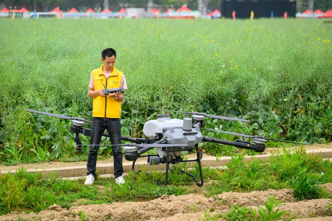 △ 2024年3月18日,廣東省東莞市石碣鎮(zhèn)掀起春耕生產(chǎn)熱潮。圖為一名工作人員正在操作無人機(jī)。