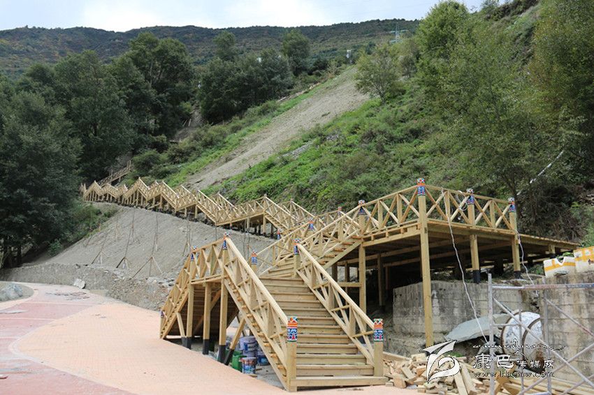 日前記者來到現(xiàn)場,實地體驗了在建中的爐巷·文成路。從甘孜日報社到公主橋,一路上河堤已經(jīng)用漢白玉的石材建起了沿河欄桿,上面雕刻著吉祥八寶圖案。山路中還設(shè)計了一個較大的亭子,以這個亭子為中心,上通南無寺,下至將軍橋。一條藏式木制階梯長廊與白土坎村的阿里布果游道相連接,站在長廊的底端向上看階梯長廊,長廊就像一條在山間蜿蜒的巨龍,給爐巷·文成路添上了一抹神秘色彩。