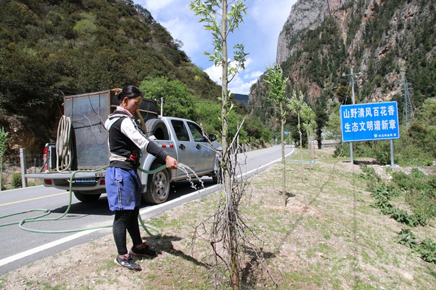 植樹(shù)容易,保持存活率很難。“植樹(shù)植樹(shù),一分栽九分管。我們植樹(shù)造林不只看數(shù)量,更注重質(zhì)量,注重栽植方法和科學(xué)的后期養(yǎng)護(hù)管理,保證樹(shù)木的成活率?!?/span>6月11日,在白玉縣絨蓋鄉(xiāng),長(zhǎng)江造林局駐白玉管護(hù)站站長(zhǎng)梁榮忙著進(jìn)行現(xiàn)場(chǎng)管護(hù)技術(shù)指導(dǎo),“把遮陽(yáng)網(wǎng)裹緊點(diǎn)、把刺巴綁緊點(diǎn),以免牛和馬啃皮子;水要澆透,不然水分不夠,樹(shù)子一斷水,再想‘返陽(yáng)’就難了;護(hù)欄水泥樁要栽牢,不然牛馬一撞就倒了……”。