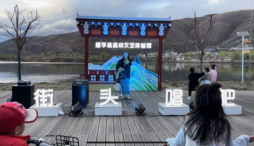 “童心向黨做棟梁,我們小小少年郎美好明天共展望……”稚嫩的歌唱聲從道孚縣濕地公園傳來,跟隨童聲看過去,懸掛著“道孚縣流動(dòng)文藝體驗(yàn)館”字樣燈牌,以道孚縣特色民居創(chuàng)意為舞臺(tái)背景,擺放著“街頭唱吧”字樣燈牌的舞臺(tái)上,一個(gè)小女孩站在人群前面舉著話筒聲情并茂的演唱著《童心向黨》。