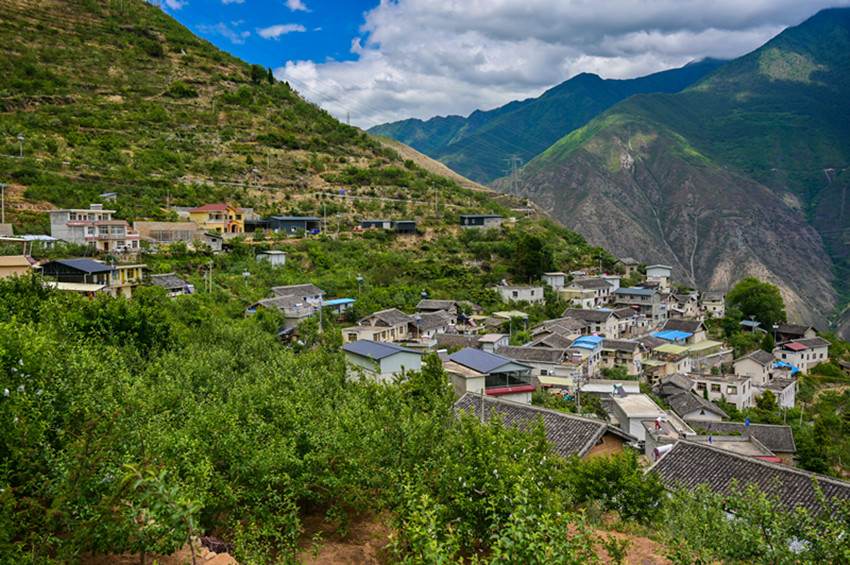 仲夏時(shí)節(jié),漫步在藍(lán)天白云下的黃草坪村,一個(gè)個(gè)雞蛋大小的蘋果、枇杷掛滿枝頭,撲面而來(lái)的果香味沁人心田。放眼望去,山谷間一團(tuán)團(tuán)云霧纏繞在大山峭壁間,山腳下,大渡河猶如一條青色的綢緞,歡騰的河水正述說(shuō)如今黃草坪村的幸福生活。