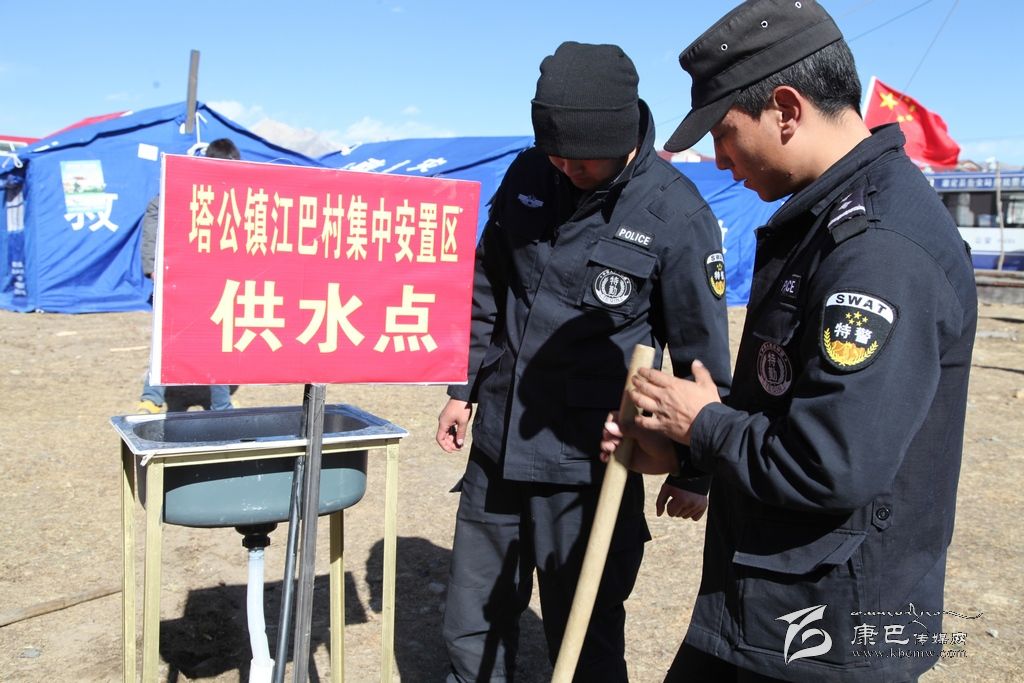 走進(jìn)江巴牧民新村安置點(diǎn)我們看見(jiàn)幾位管道工人和特警正在忙碌著挖埋管道,管道的旁邊豎起了一個(gè)紅色的牌子,上面寫(xiě)著塔公鎮(zhèn)江巴村集中安置區(qū)供水點(diǎn),據(jù)挖埋管道的人員介紹,按照康定縣水務(wù)局的要求,安置區(qū)供水點(diǎn)經(jīng)過(guò)兩天的時(shí)間總共建成了兩處,康定縣水務(wù)局在災(zāi)區(qū)明確方式,分類(lèi)援助,主要從水源、管道、集中供水點(diǎn)和水質(zhì)保障四個(gè)環(huán)節(jié)解決供水問(wèn)題。保證了大批災(zāi)區(qū)群眾和救援人員的生活用水,有效預(yù)防了疫情的發(fā)生。