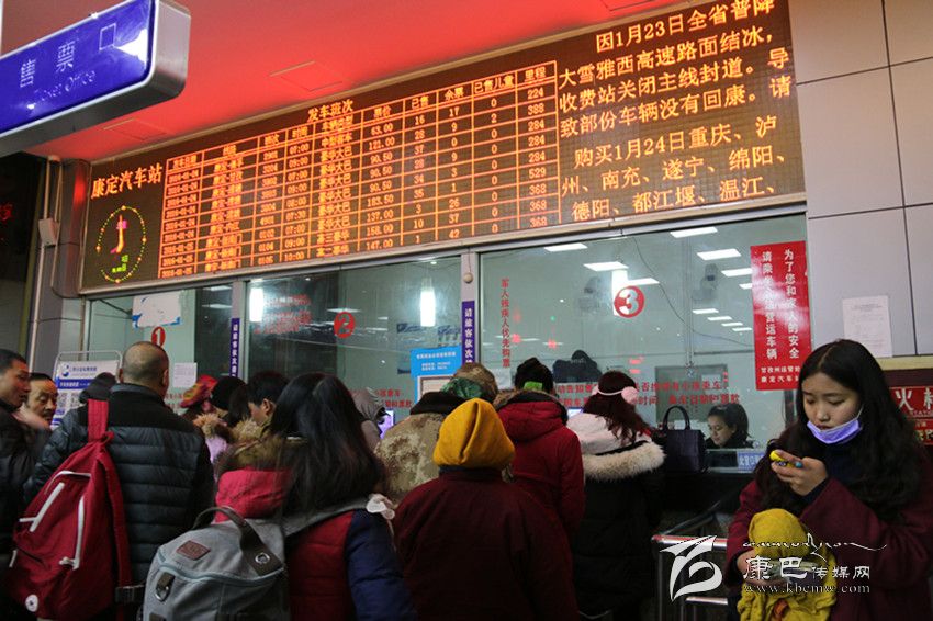 原來,汽車站售票窗口上方的視頻上滾動(dòng)播放著:“因1月23日全省普降大雪,雅西高速路面結(jié)冰,收費(fèi)站關(guān)閉主線封道,導(dǎo)致部分車輛沒有回康定。請購買1月24日到重慶、瀘州、南充、遂寧、綿陽、德陽、都江堰、溫江、雙流(1402次)、仁壽、眉山、西昌、宜賓、安岳、廣安的旅客到售票窗口退換車票。”