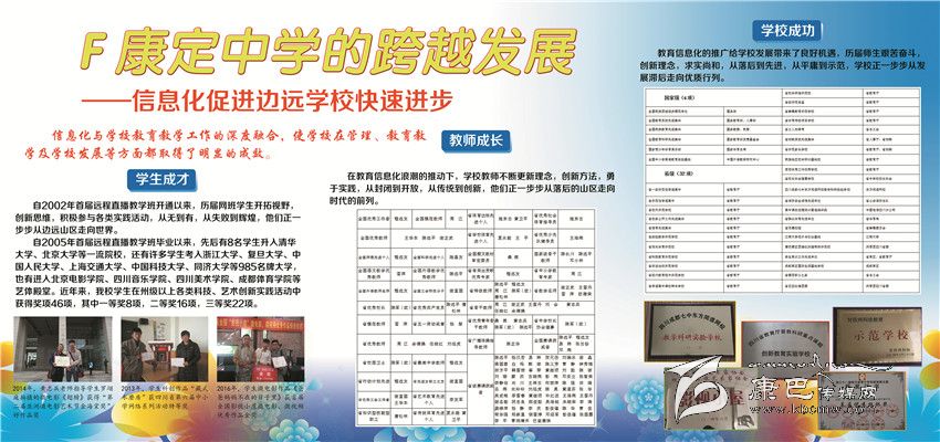 2002年以來康定中學(xué)立足民族地區(qū)教育實際,依托成都七中優(yōu)質(zhì)教育,先后開通成都七中高中直播班、初中錄播班,建成初中遠(yuǎn)程直錄播教學(xué)AB平臺,實現(xiàn)了與國內(nèi)名校共享優(yōu)質(zhì)教學(xué)資源的目標(biāo),將網(wǎng)課教學(xué)打造成學(xué)校教育品牌。經(jīng)過近5000名師生員工的不懈努力,2013年來,康定中學(xué)連續(xù)4年高考硬上本科人數(shù)突破200人大關(guān)。先后有8名學(xué)生被北京大學(xué)和清華大學(xué)錄取。中考綜合評比連續(xù)9年保持全州第一。
