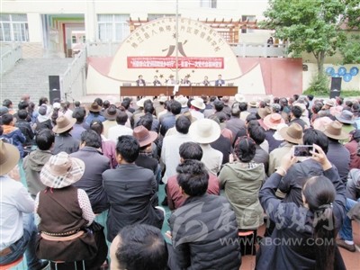 在雅江縣河口鎮(zhèn)希望小學(xué)的廣場(chǎng)上,來自全鎮(zhèn)各村的430名群眾齊集一堂,認(rèn)真聆聽宣講團(tuán)成員其美貢布和劉美翁姆的宣講。