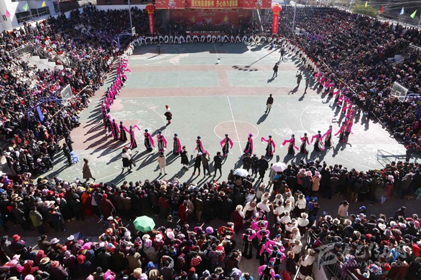 當日晚,該縣舉辦新春篝火鍋莊晚會,縣內的快樂阿媽、夕陽紅等7支藝術團到場表演,她們身著瘋裝、穿戴華麗,用鍋莊舞共慶佳節(jié)。歡快的旋律、優(yōu)美的舞蹈,吸引了大批市民參與其中,整場晚會氣氛熱烈、其樂融融。