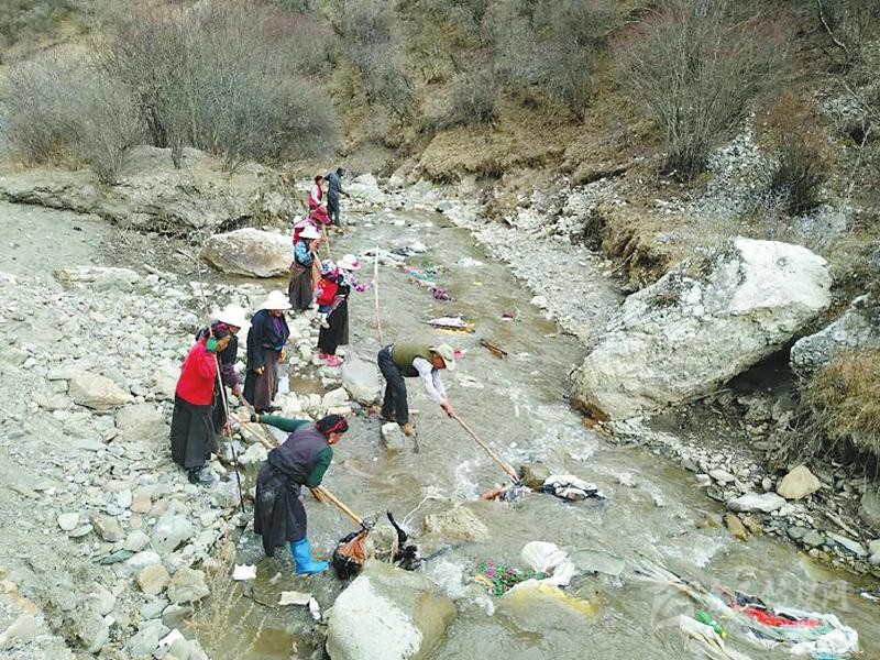 說干就干,黃先明帶領(lǐng)駐村工作隊(duì)隊(duì)員和村兩委班子成員不畏嚴(yán)寒,首先把全村的道路、公共設(shè)施場(chǎng)地進(jìn)行了清掃,把道路兩邊的小土堆全部鏟平并種上花草,把村民房前屋后的柴火、廢料等重新清理并制定擺放標(biāo)準(zhǔn)。在河道整治中,黃先明帶領(lǐng)村干部沖在前面,對(duì)不容易清理到的垃圾,還跳到河里去撿。3月的高原還很冷,鞋子很快被交納河水打濕,但大家全然不顧?!包S隊(duì)長(zhǎng)都帶頭干,我們更要努力。”交納村村民巴登鄧珠說。